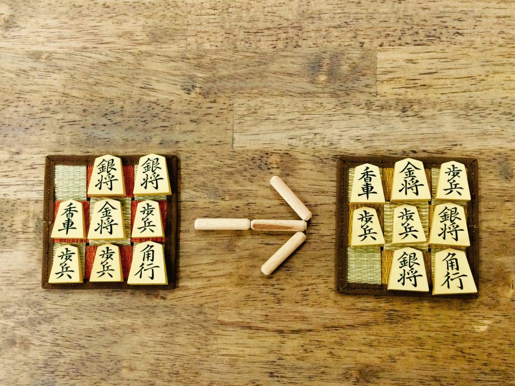 駒の動き方に従って駒を動かしながら、左の図を右の図と同じようにしてください。