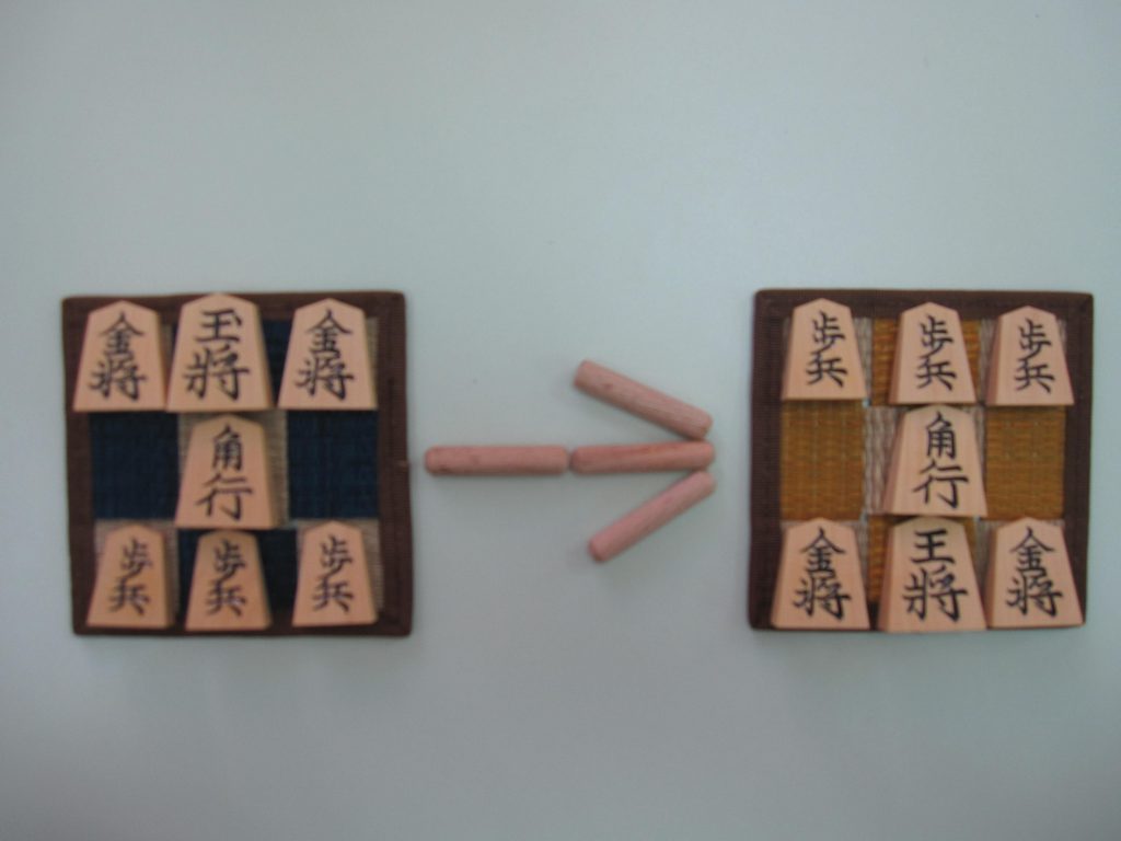 駒の動き方に従って駒を動かしながら、左の図を右の図と同じようにしてください。