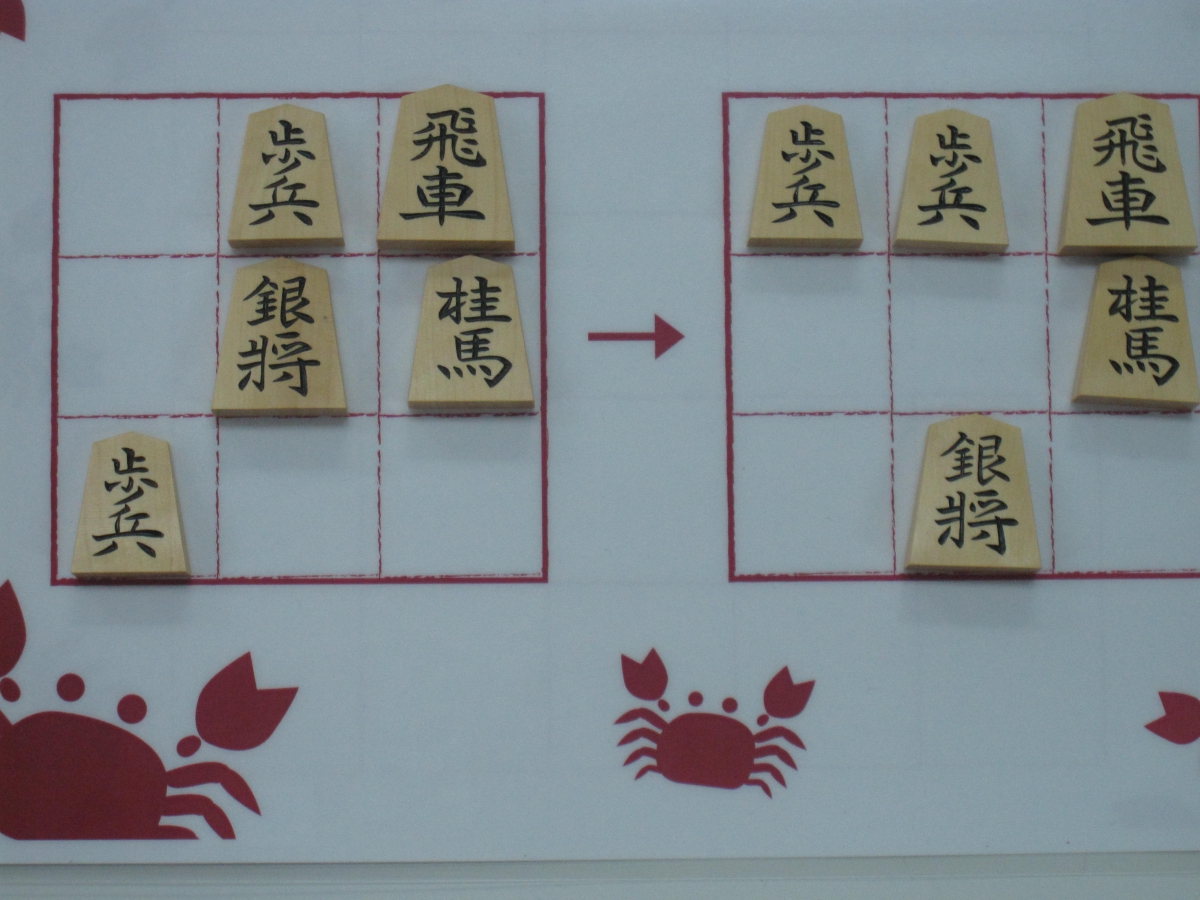 駒の動き方に従って駒を動かしながら、左の図を右の図と同じようにしてください。